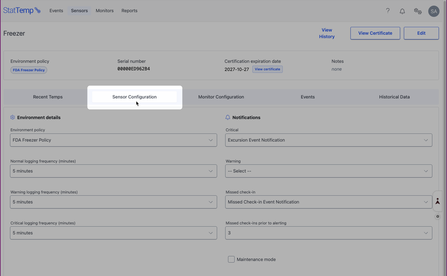To update a sensor’s settings, such as its name, environment policy, read frequency, or notification preferences, follow the steps below.
