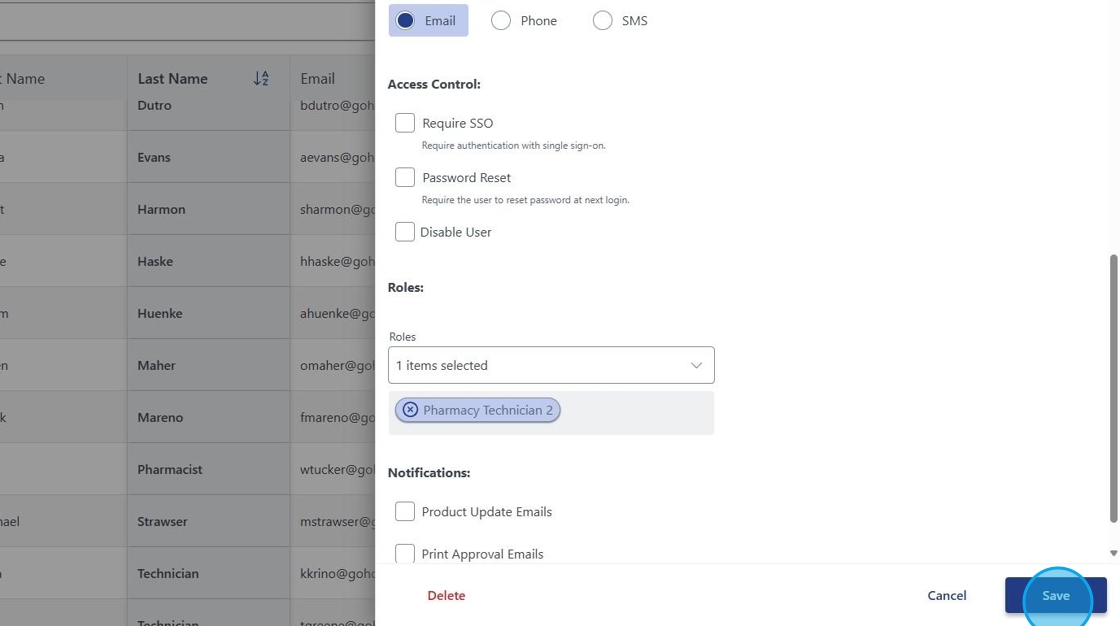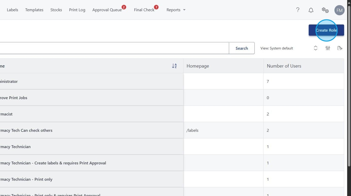 3. Enter a Desired Role name and select ability's you would like designated users with this role to have. Example of a Pharmacy Technician are as follows.