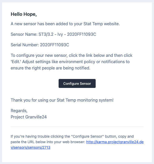 Stat Temp now sends an email notification whenever a new sensor comes online. This helps system admins and designated users know exactly when to finish setup, naming the sensor, assigning an environment policy, and configuring read frequency or notifications.