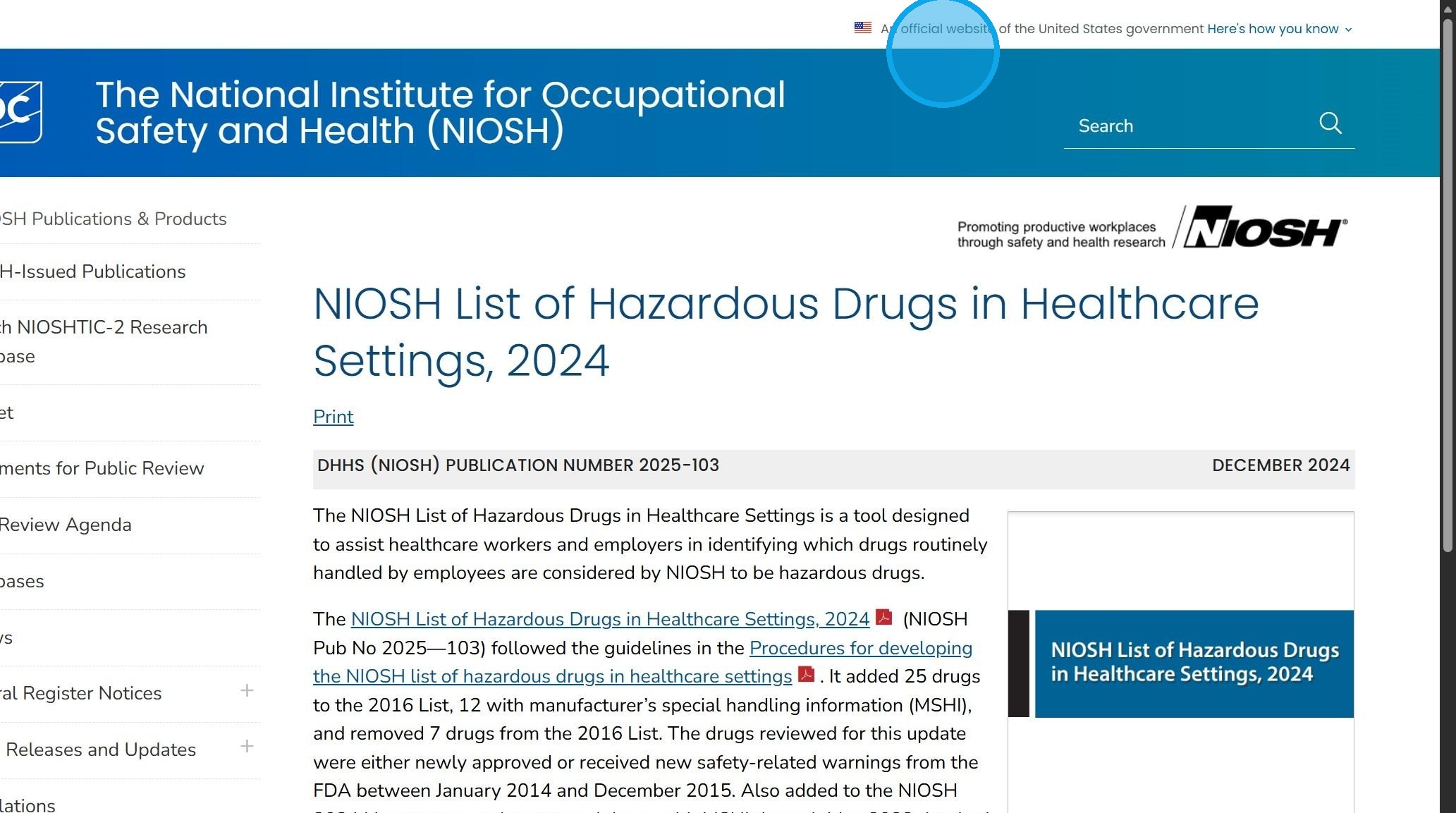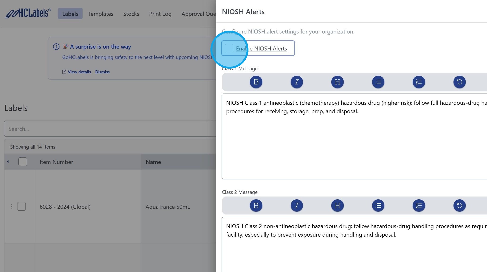 Turn on NIOSH Alerts in goHCLabels in just 3 easy steps to stay informed about critical safety and health updates related to occupational hazards. This feature provides quick access to trusted guidance from NIOSH, the CDC, and the FDA, including important information on drug safety and proper handling.