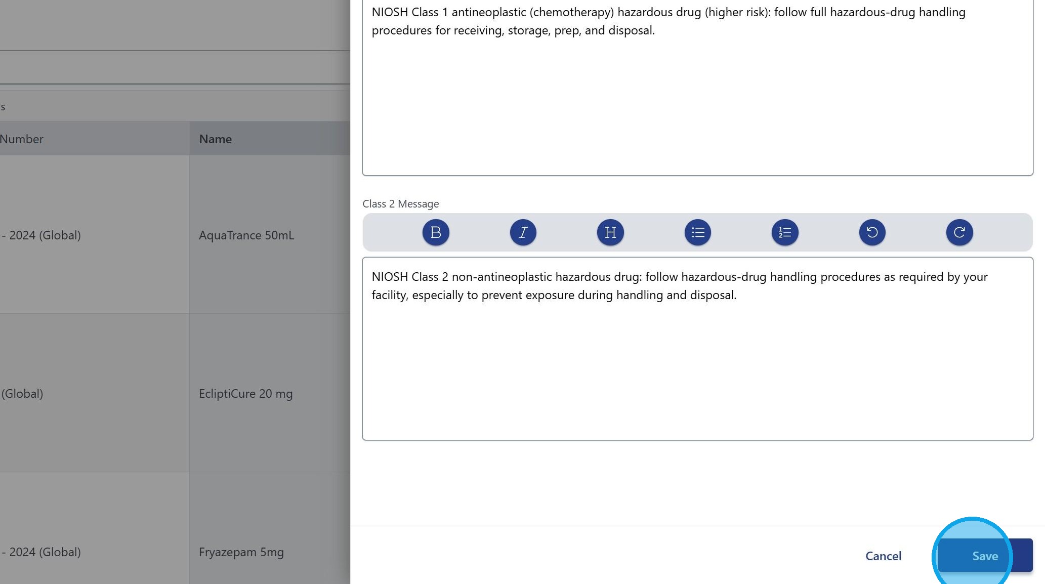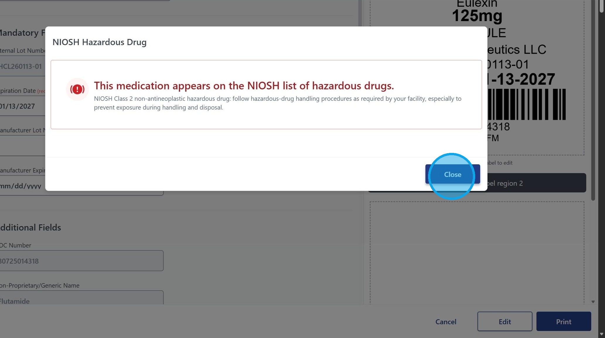 5. NIOSH alerts will display on the screen the next time a label is printed for any associated drug on this list. Alerts do not appear during label creation - only at the time of printing.