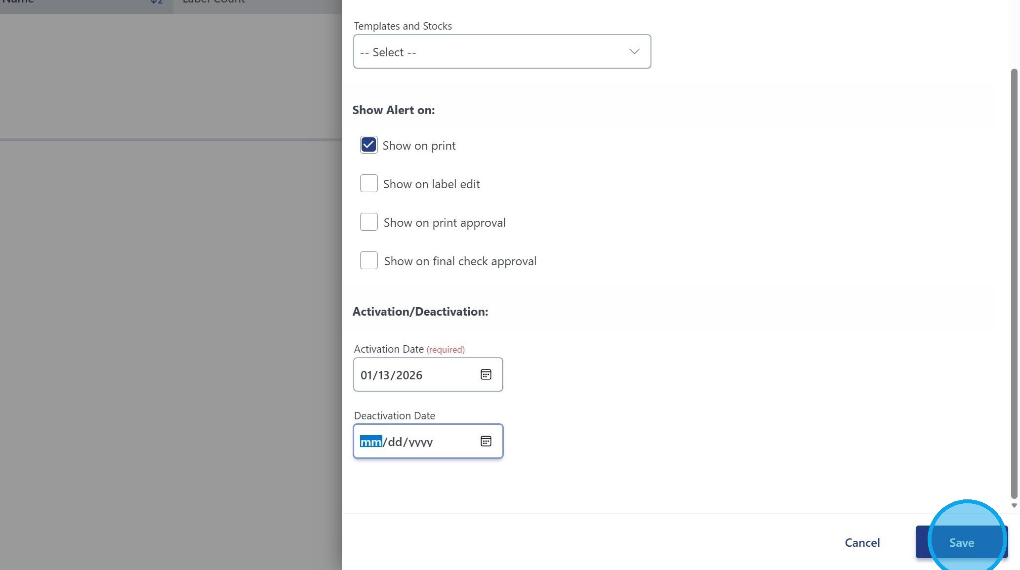 6. You can select an Activation Date as well as make the alert indefinite by leaving the Deactivation Date as the default. Click "Save"