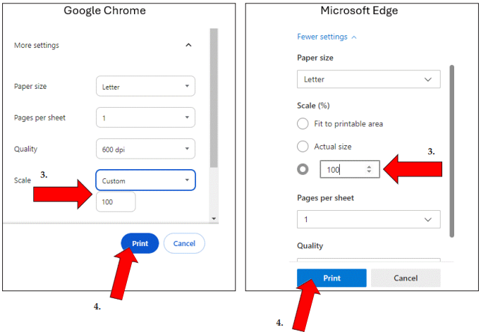 3. Change the Scale setting from Fit to Printable Area to Custom: 100 in Chrome or 100% in Edge.